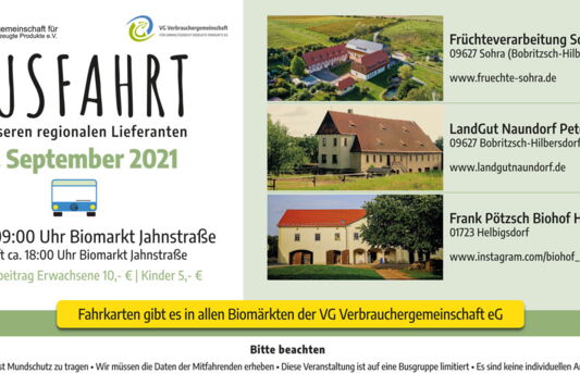 Unsere herbstliche Busfahrt zu regionalen Lieferant:innen findet dieses Jahr am Sonntag, 19. September 2021 statt. Wir starten um 9:00 Uhr ab Jahnstraße (VG Mitte). Die erste Station wird die Früchteverarbeitung Sohra GmbH sein, anschließend geht es weiter zum LandGut Naundorf Peter Probst und …