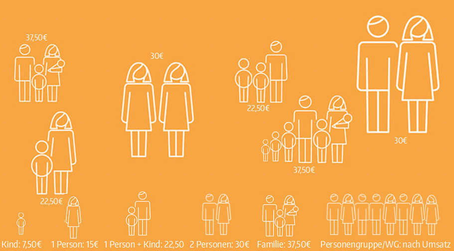 Erwachsene bezahlen nun 15€ pro Person statt 17€. Der Kinderbeitrag beträgt 7,50€ für das erste Kind (vorher 8,50€), jedes weitere Kind im Haushalt ist beitragsbefreit. Für juristische Personen/Personengesellschaften (WGs) beträgt der Sockelbeitrag nun 16€ statt 18€.