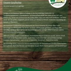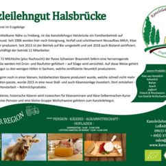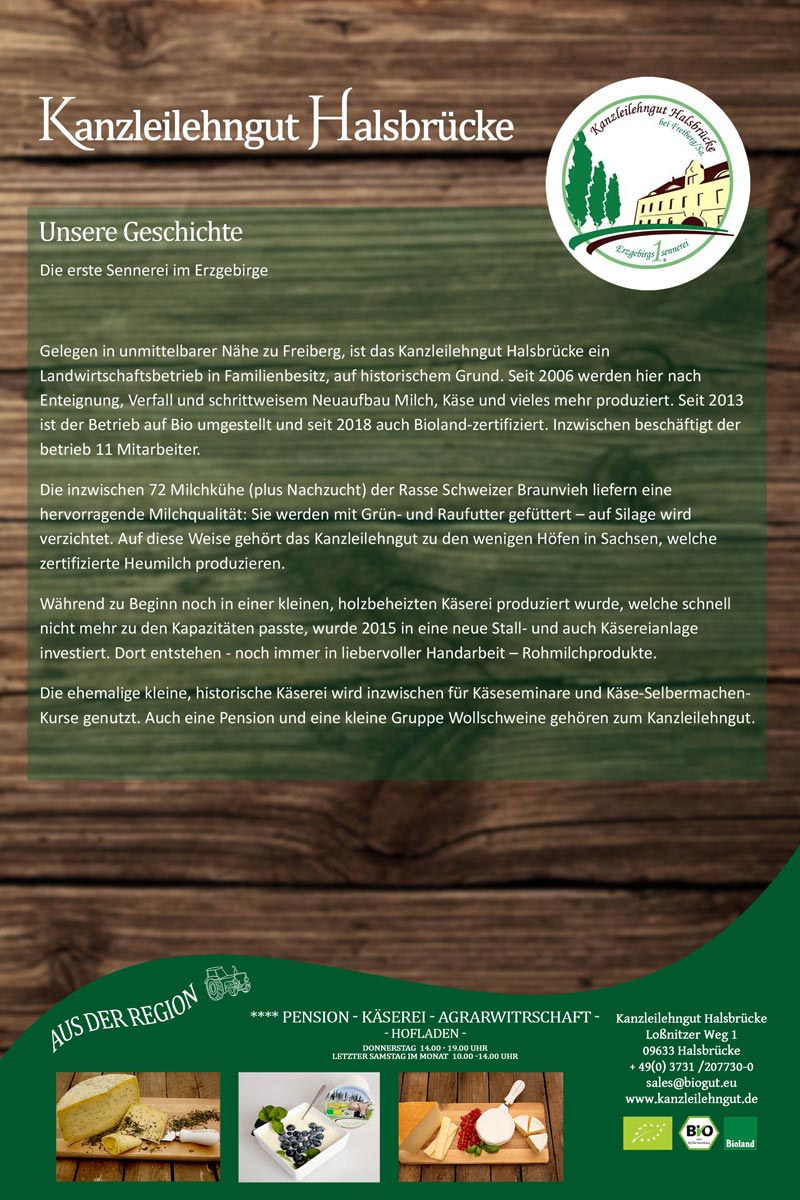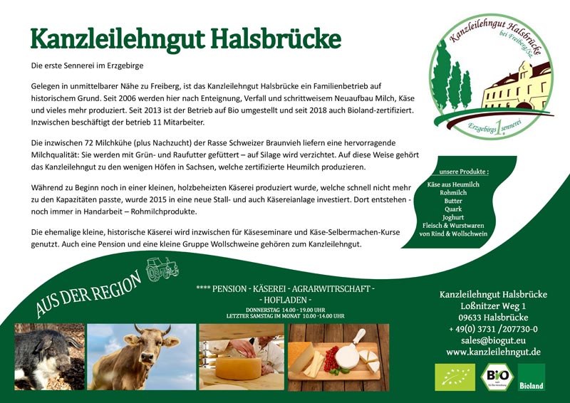 Gelegen in unmittelbarer Nähe zu Freiberg, ist das Kanzleilehngut Halsbrücke ein Familienbetrieb auf historischem Grund. Seit 2006 werden hier nach Enteignung, Verfall und schrittweisem Neuaufbau Milch, Käse und vieles mehr produziert. Seit 2013 ist der Betrieb auf Bio umgestellt und seit 2018 auf Bioland-zertifiziert. Inzwischen beschäftigt der Betrieb 11 MitarbeiterInnen.