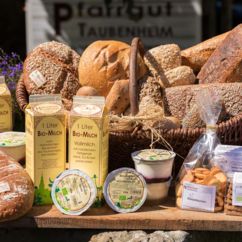 - Trinkmilch von der eigenen Milchkuhherde, frisch pasteurisiert in der Hofmolkerei