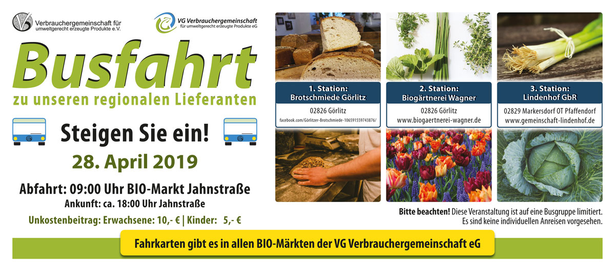 Am Sonntag, 28. April 2019 fand wieder eine VG-Busfahrt zu drei unserer regionalen Lieferanten statt. Pünktlich um 9.00 Uhr startete der voll besetzte Bus zu den Stationen Görlitzer Brotschmiede in Görlitz, Bio-Gärtnerei Wagner in Görlitz und dem Lindenhof einem Landwirtschaftsbetrieb in Pfaffendorf.