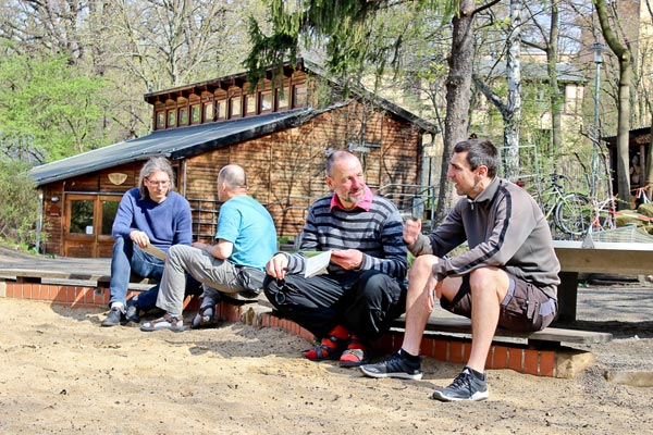 Da wir das Grundstück nicht gerne alleine nutzen wollen, haben wir Nistkästen für Fledermäuse und Spatzen aufgehängt, die uns freundlicher Weise von der Stadt Dresden zur Verfügung gestellt wurden. Demnächst wird auch noch ein Insektenhotel Platz für neue Mitbewohner bieten.