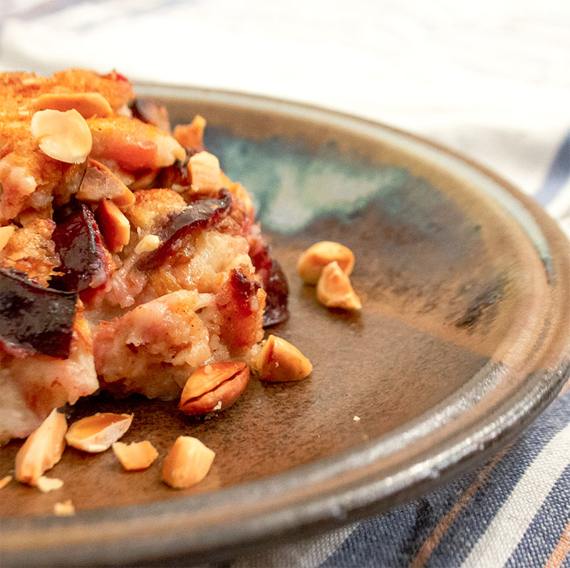Für beide Varianten: Die Masse in eine gefettete Auflaufform füllen und 45 Minuten backen (mittlere Schiene). Nach 30-35 Minuten die gehackten Mandeln auf die Masse geben und den Rest der Backzeit mit backen.