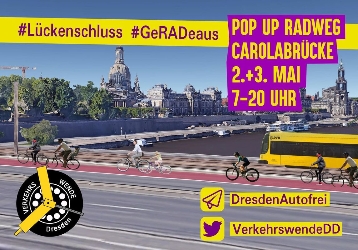 Verkehrswende Dresden: Demo mit PopUp-Radweg über die Carolabrücke